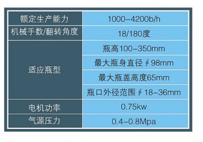 本產品自動化程度高,節省人工:機械手工作穩定可靠,產品檢驗簡單明了:翻轉導軌與機械手同步協調,增大了瓶高適應范圍。